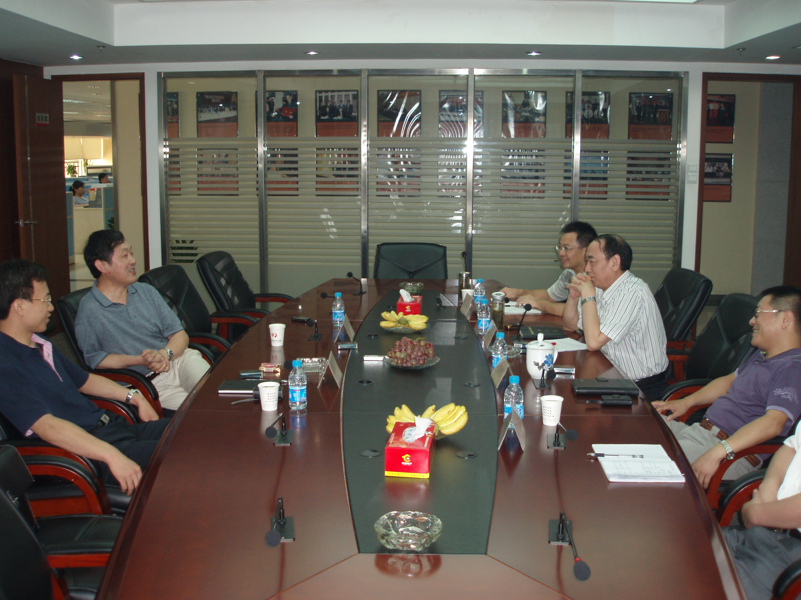 2009年8月17日,北京产权交易所董事长熊焰、合作发展部总经理魏铁锋一行来到武汉光谷联交所,就两地产权市场建设、项目合作发展等事宜进行座谈。我所董事长徐春江、总经理王新刚、副总经理龚波、程家忠参加了接待和座谈活动。