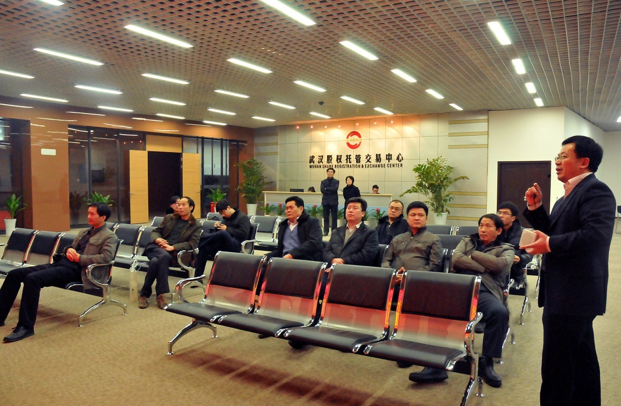 1月10日下午,河北省沙河市副市长王建江一行在湖北省政府咨询委员、武汉大学中国金融工程与风险管理研究中心主任叶永刚教授的陪同下,到武汉股权托管交易中心考察调研。