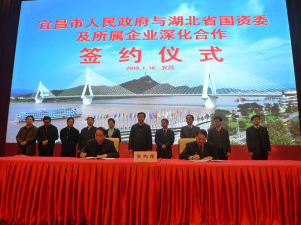 宜昌市委副书记、市长李乐成和省国资委主任杨泽柱签订了加快宜昌现代化特大城市建设的战略合作协议。宜昌市委常委、常务副市长宋文豹代表市政府与三环集团公司、大冶有色金属集团控股有限公司、湖北省长江产业投资有限公司、湖北省工业建筑集团有限公司、武汉光谷联合产权交易所、湖北省高新技术产业投资有限公司、湖北省福汉木业(集团)发展有限公司、湖北中企投资担保有限公司签订战略合作协议。同时,五峰、宜都、宜昌交运集团等与湖北银行宜昌分行等省国资委所属企业签订13个项目合作协议。