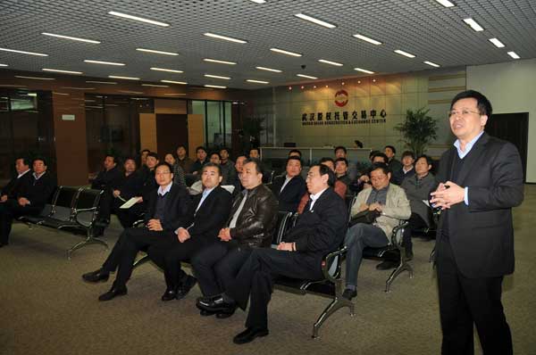 考察团首先参观了光谷资本大厦交易大厅、深交所湖北路演中心、武汉股权托管交易中心、武汉金融资产交易所和武汉农畜产品交易所,听取了各交易所的功能介绍和运行情况汇报。在中心交易大厅,总经理龚波向考察团介绍了中心股权登记托管、挂牌交易、股权融资等系统功能和运营实效。