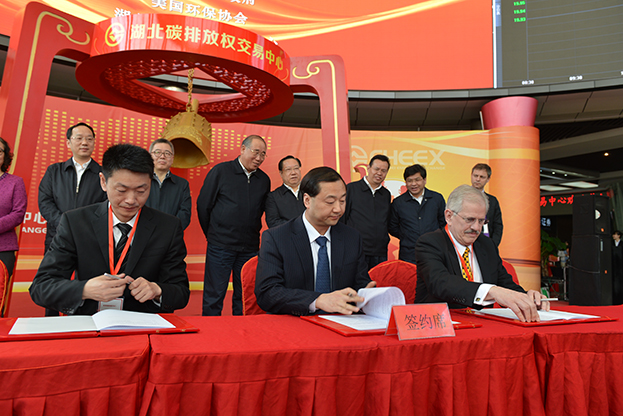 启动仪式上,湖北省发展改革委副主任甄建桥代表省发改委同山西、安徽、江西等中部省份发展改革委及广东省发改委签订了“碳排放权交易跨区域合作交流框架协议”。湖北碳排放权交易中心董事长徐春江代表交易中心同中国建设银行、中国民生银行、上海浦发银行代表签署总额达600亿的“低碳产业发展与湖北碳金融中心建设授信协议”。神农架林区政府与美国环保协会、湖北碳排放权交易中心签订碳资产开发与低碳扶贫战略框架协议。