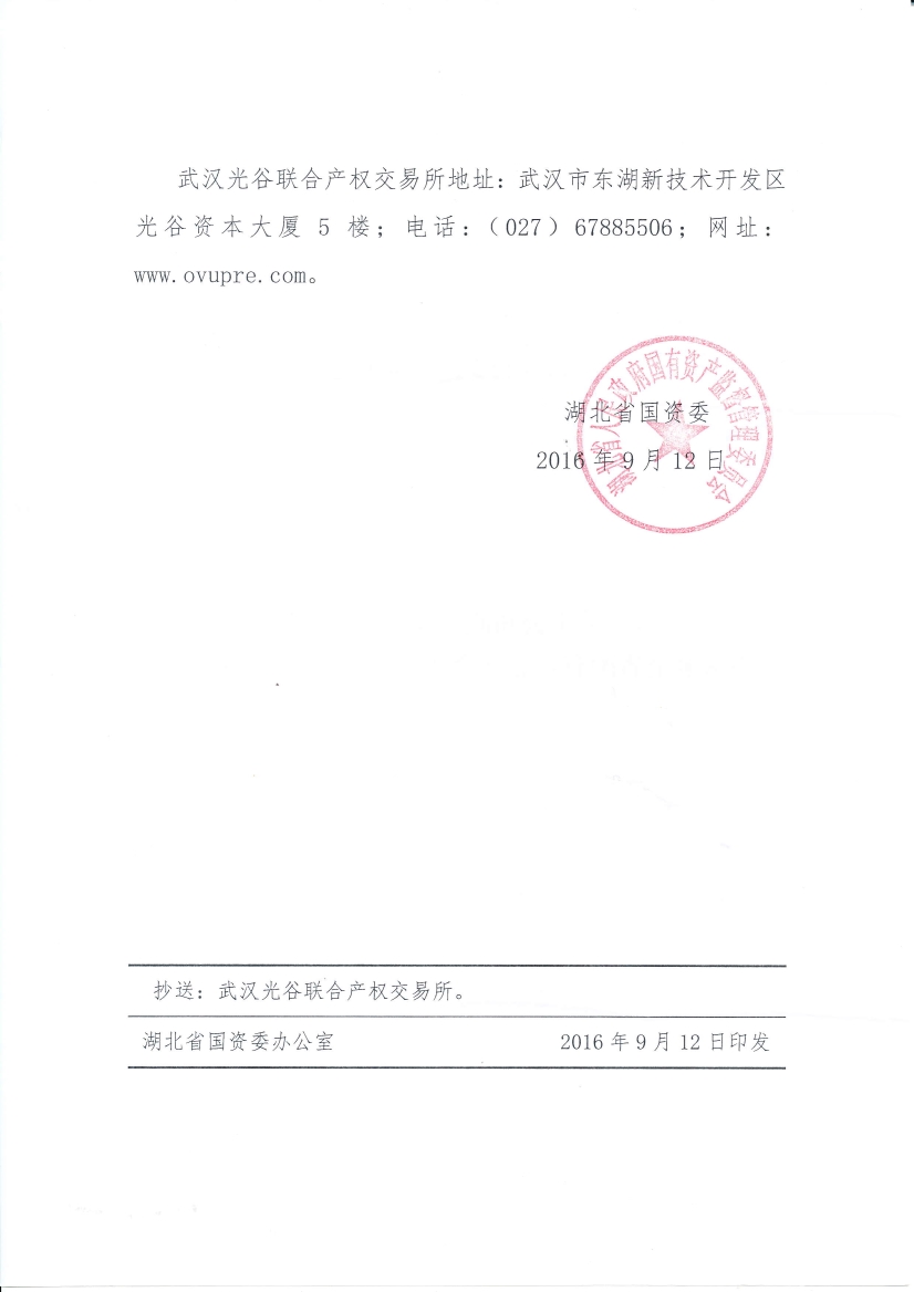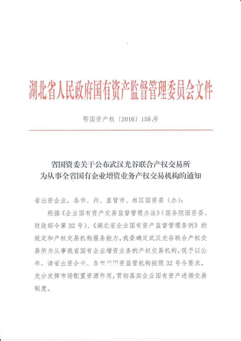 9月12日 ,省国资委向省出资企业和各市、州、直管市、林区国资委(办)下发了《关于公布武汉光谷联合产权交易所为从事全省国有企业增资业务产权交易机构的通知》(鄂国资产权【2016】158号),明确指定我所为唯一从事全省国有企业增资业务的定点产权交易机构。